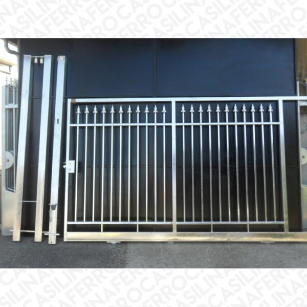 Elementi verticali in tubolare 20×20, ferro ad U 50x30x3 completo di colonne a ponte, colonna di battuta, serratura, maniglia, fine corsa e guida.