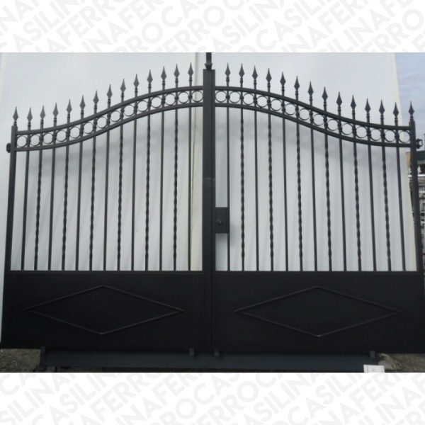 Cancello carrabile mod. C6 zincato costruito con telaio tubolare 4×4, elementi verticali in quadro pieno del 16 tortigliato alternati a quadro del 16 dritto.